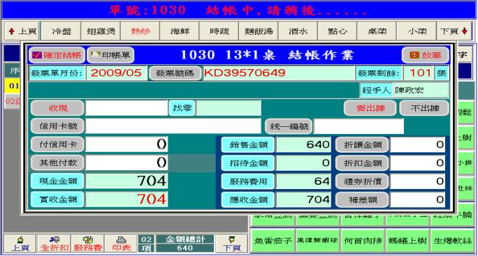 消費券不足補現金操作方式:步驟一:按結帳鍵,藍色現金金額NT$ 704元,如消費券客戶拿1張500元,因消費券面額不足付款,帳面上是少NT$ 204元,先至其他付款處輸入NT$ 500元,按結帳即可完成交易.如客戶需再付現金NT$ 204元,是用NT 1,000元再至收現鍵輸入NT$ 1000元,即可知找零金額.