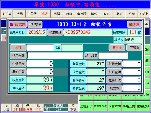 消費券當現金付款現金操作方式:步驟一:按結帳鍵,藍色現金金額NT$ 297元,如消費券客戶拿2張400元,按結帳即可完成交易.消費券多收NT$ 103元.